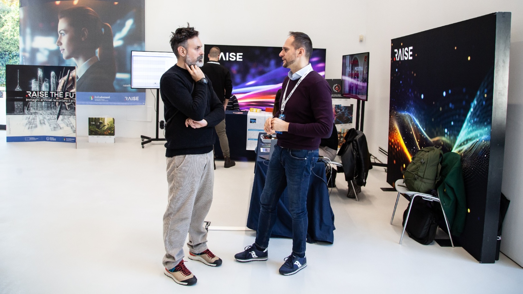 Nello spazio Corner, antistante l’ingresso principale del museo, sono state esposte tutte le 52 immagini digitali, sui temi della città intelligente e inclusiva, della cura dell’ambiente con l’eco-robotica, della sanità personalizzata e assistita con la tecnologia e del porto smart. Inoltre, il team di Comunicazione ha realizzato con CNR-ITD un video ad hoc, per presentare il “backstage” della co-creazione di immagini con strumenti di AI, mostrandone le potenzialità, ma anche il contributo fondamentale dell’immaginazione e della creatività umana. Lo spazio è stato allestito con la scenografia dei quattro temi principali di RAISE e si sono alternati su tre giorni, ricercatori e ricercatrici, tecnologi e tecnologhe per presentare, alcune delle attività in corso all’interno di RAISE e alcuni dei risultati raggiunti con dimostrazioni pratiche.