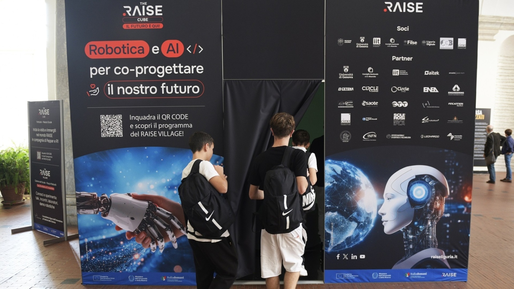 Fin dalla prima installazione del RAISE Cube, allestito nei porticati di Palazzo Ducale, i robot Pepper ed R1 hanno presentato a visitatori e visitatrici – in particolare giovani e famiglie – i principali risultati del progetto attraverso foto, video e modelli 3D. Un ruolo centrale è stato svolto anche dalle grafiche e dalle parole chiave, inserite come filo conduttore visivo e concettuale del racconto.