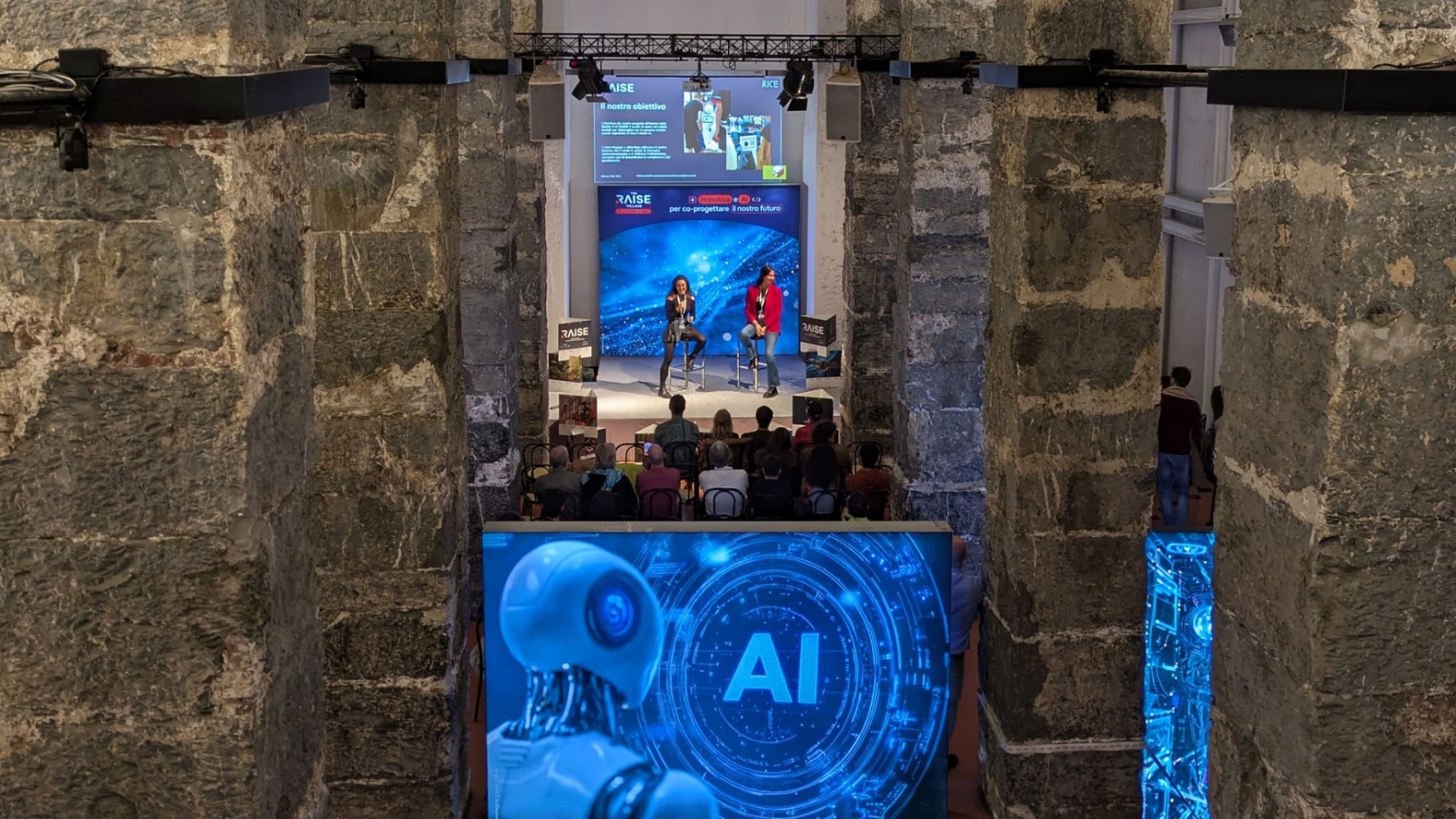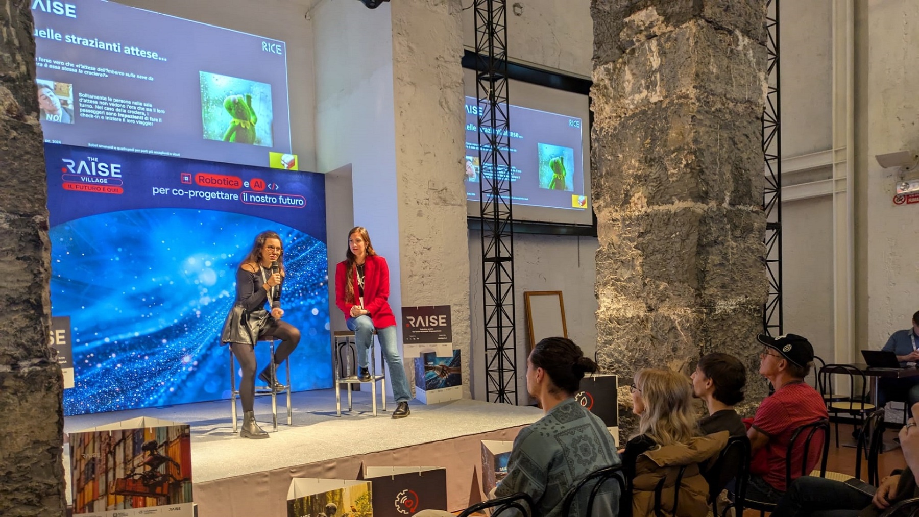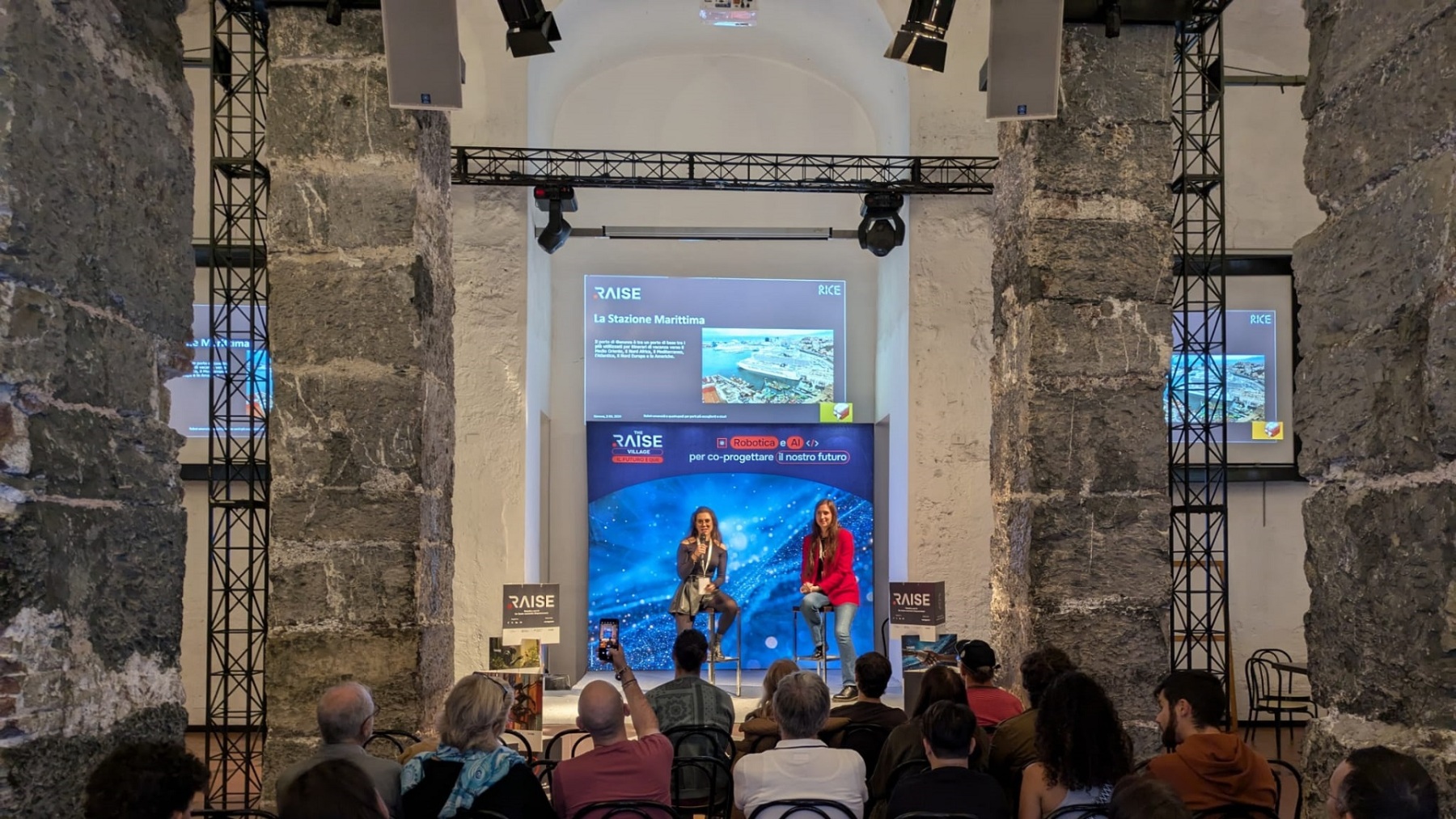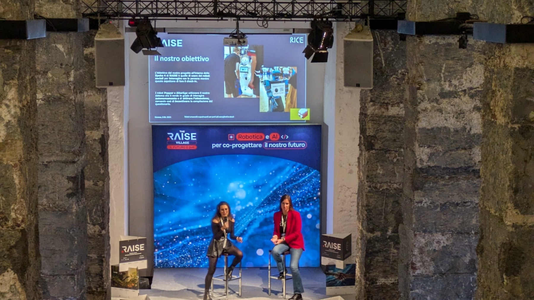 On november 2nd, on the stage of the talk area at the RAISE Village, Zoe Betta and Lucrezia Grassi from the RICE Laboratory of the University of Genoa presented a conference titled “Humanoid and Quadruped Robots for More Welcoming and Safe Ports”. The conference explored the potential of robots in interacting with people and ensuring safety in complex port environments.