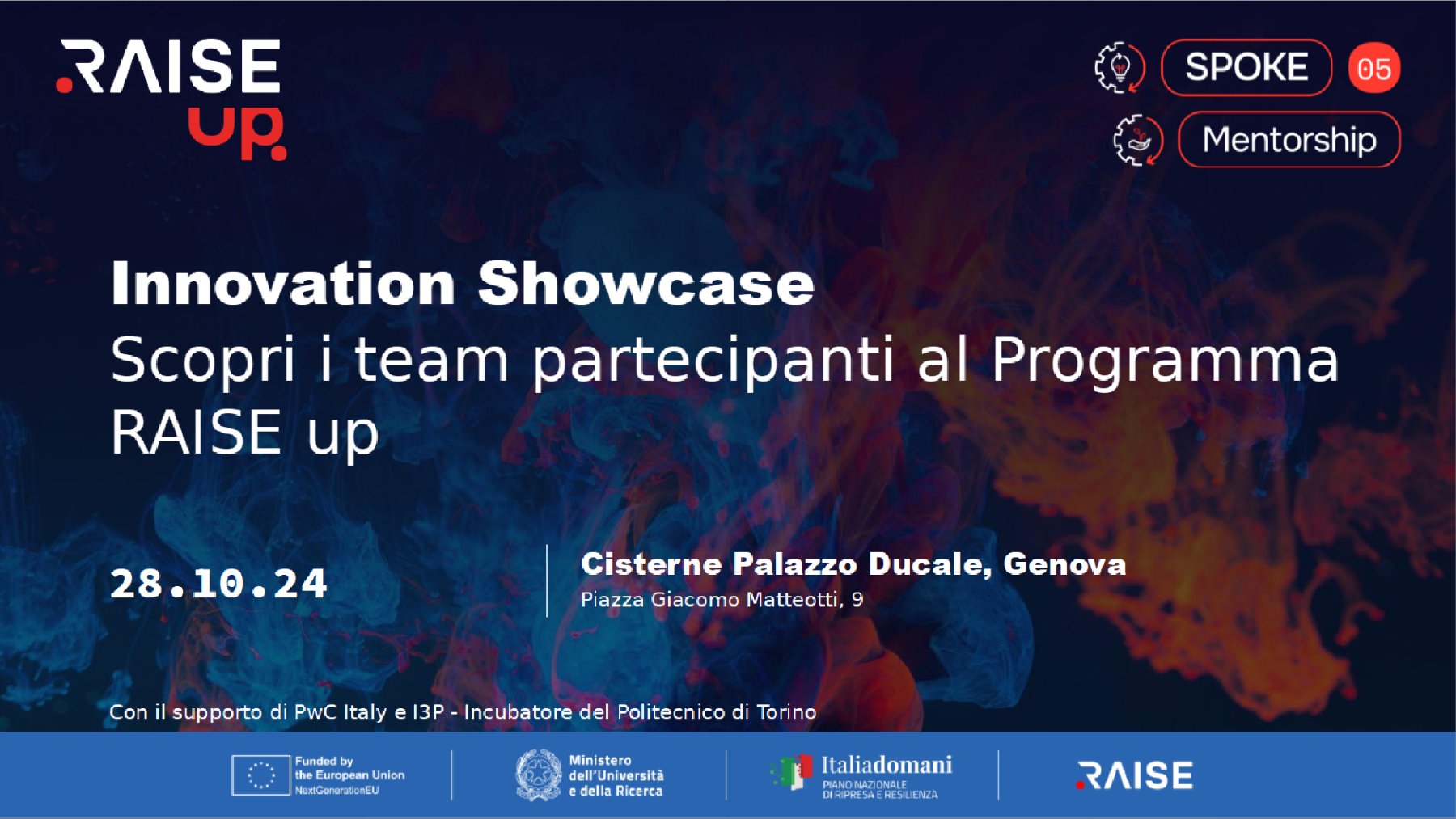 Lunedì 28 ottobre 2024, nel contesto del RAISE VILLAGE presso le Cisterne di Palazzo Ducale a Genova, si svolgerà il primo evento del programma di mentorship RAISE up, promosso da Spoke 5 e supportato da PwC Italia e I3P – Incubatore del Politecnico di Torino.