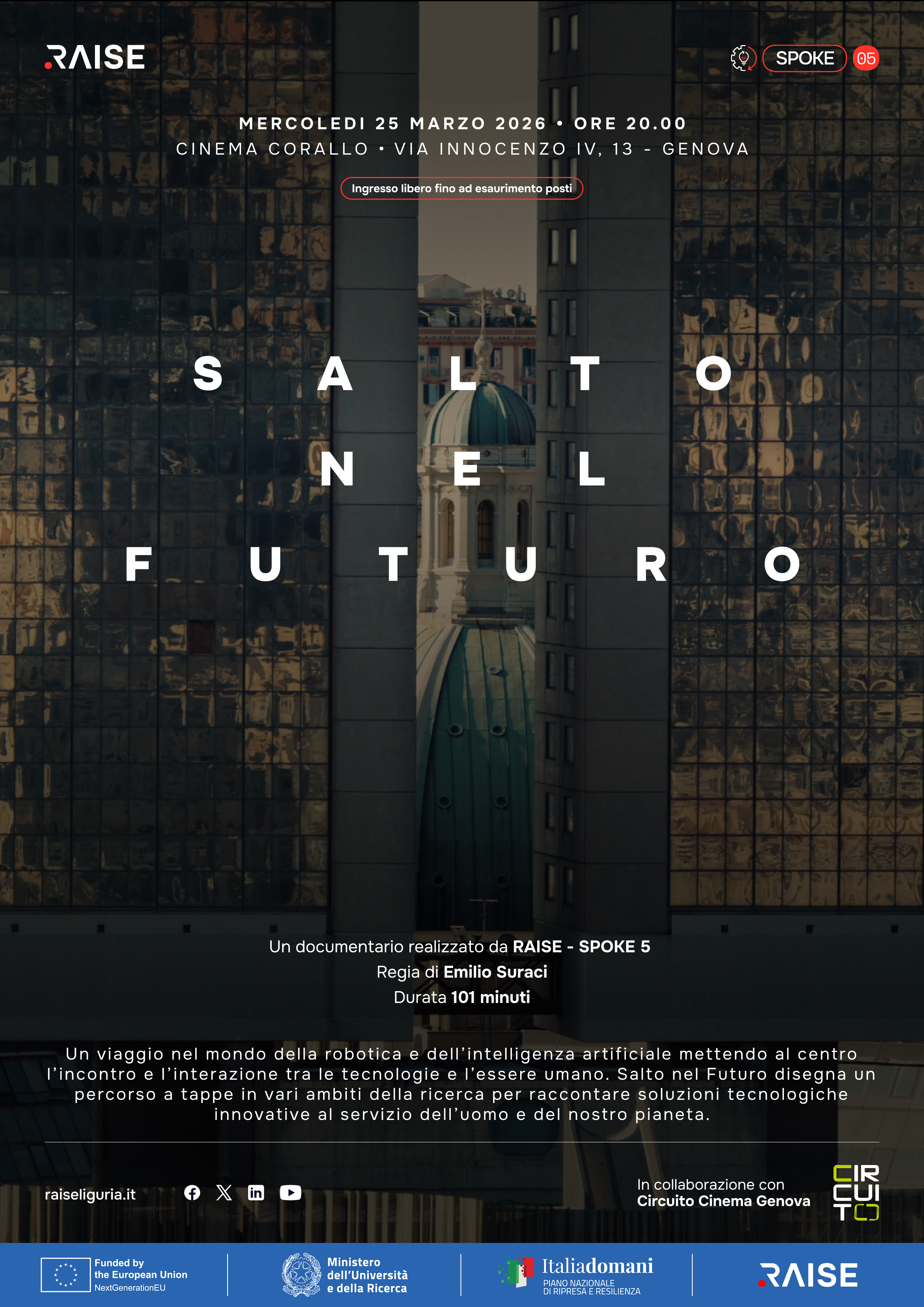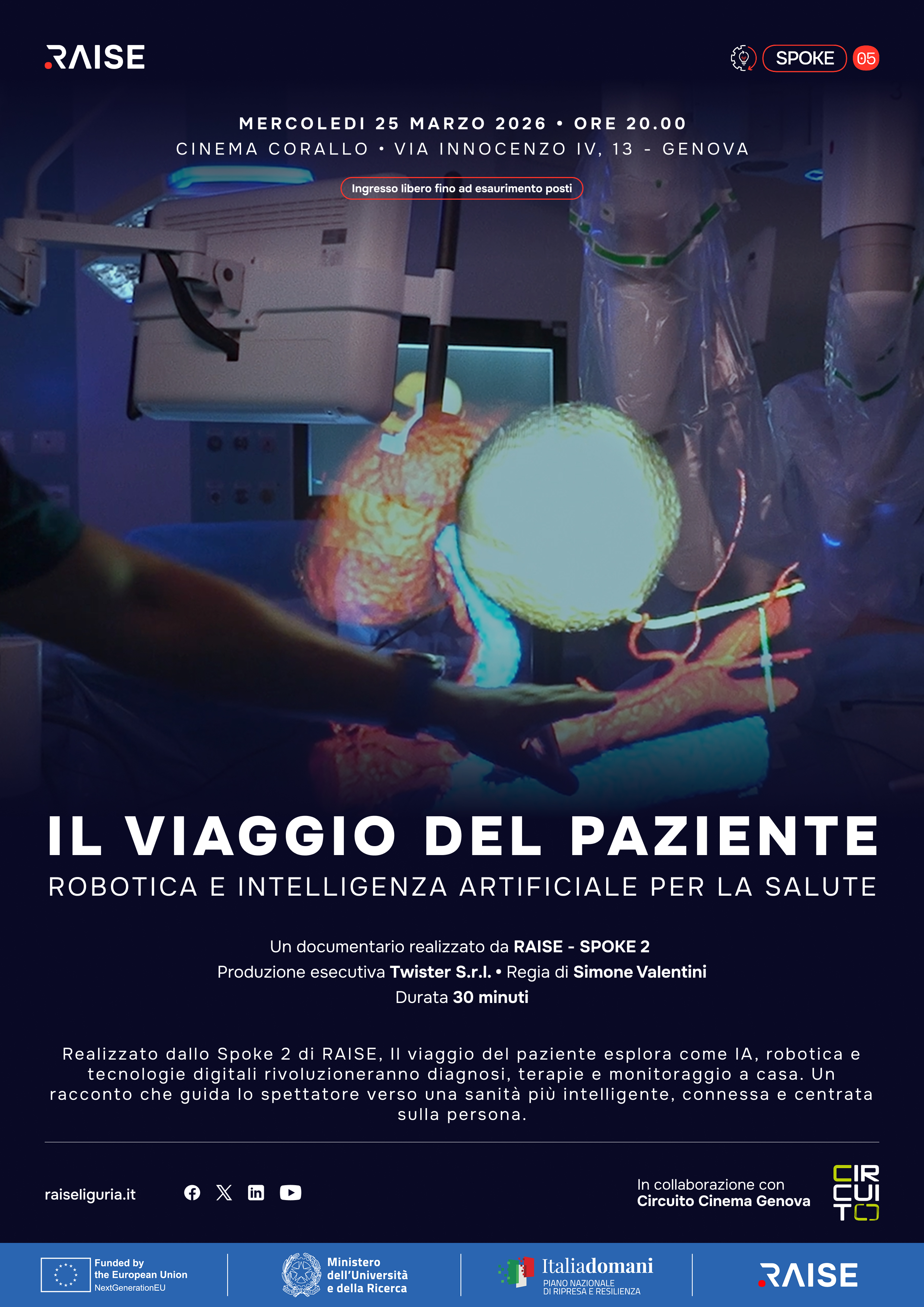 L’iniziativa nascerà dalla collaborazione con Circuito Cinema Genova e offrirà un momento di incontro tra ricerca, cultura e cittadinanza. La sala del Cinema Corallo accoglierà una narrazione capace di avvicinare il pubblico alle tecnologie sviluppate all’interno dell’ecosistema RAISE – Robotics and AI for Socio-economic Empowerment – attraverso il linguaggio diretto e coinvolgente del cinema documentario.