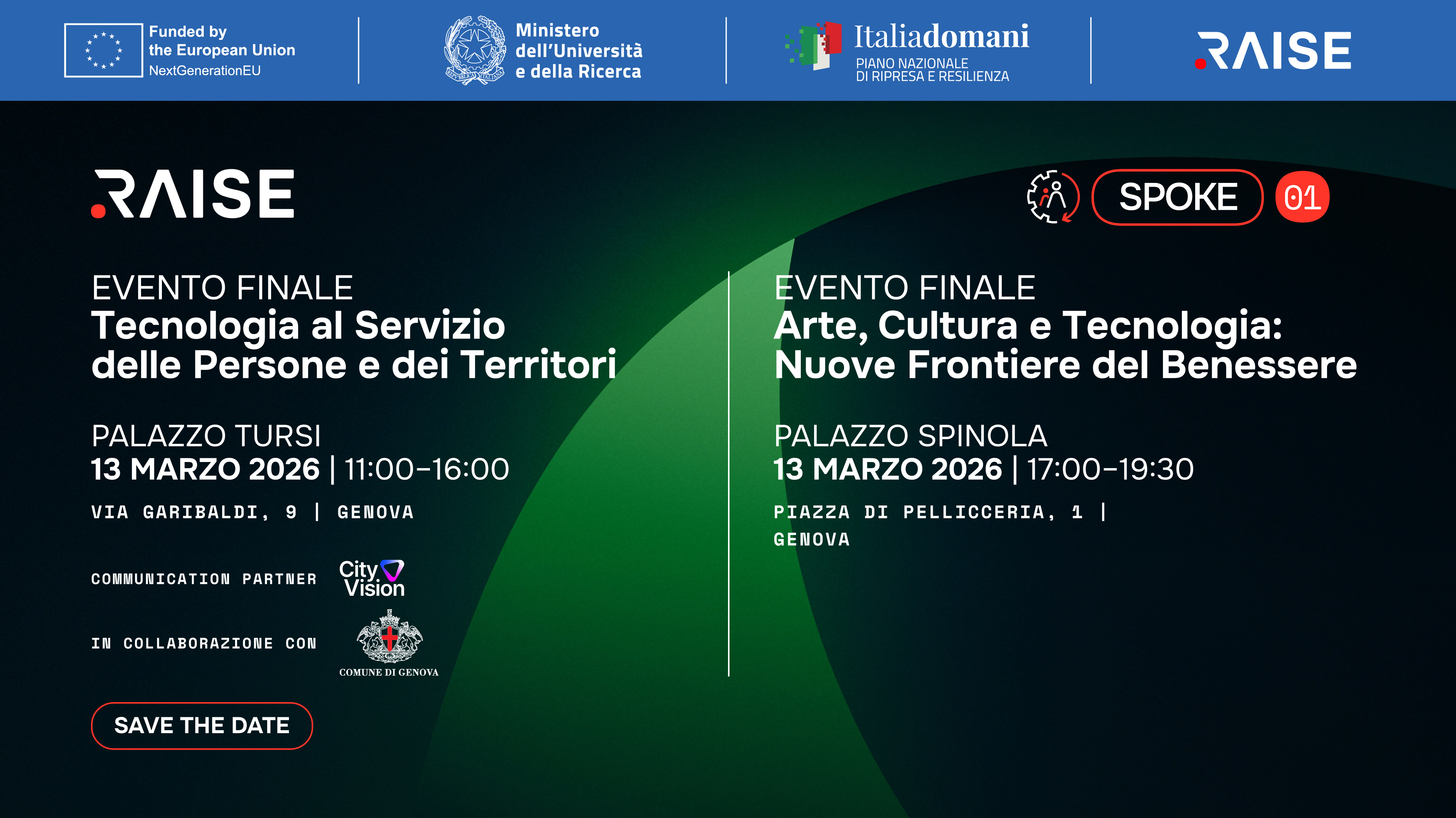 Il 12 e 13 marzo 2026 Genova ospiterà due giornate dedicate alla presentazione dei risultati e delle prospettive di sviluppo di RAISE Spoke 1 dedicato al tema delle tecnologie urbane per un coinvolgimento inclusivo. L’iniziativa offrirà un momento di confronto tra ricerca, imprese, istituzioni e territorio per raccontare il percorso realizzato negli ultimi anni e valorizzare le tecnologie sviluppate nell’ambito del progetto.